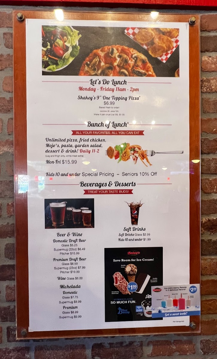 The Shakey's Pizza Parlor Menu at 155 S Avenida Caballeros, Palm Springs, CA, invites you to dive into a fun and casual dining experience, perfect for family gatherings or a relaxed night out. Whether you're craving crispy, cheesy pizzas or tasty appetizers, there's something for everyone. Their pizza options range from classic favorites like pepperoni and veggie to their signature creations, all served with fresh ingredients and bold flavors. Pair your pizza with delicious sides like garlic bread, crispy chicken wings, or the famous Mojo potatoes for the ultimate meal. If you're in the mood for a light bite, their salad offerings won’t disappoint either. A visit to Shakey's wouldn't be complete without indulging in a sweet dessert, so don’t forget to treat yourself to one of their irresistible pies or ice creams. With generous portions and a menu designed to satisfy every craving, Shakey's is the perfect spot for a laid-back meal with great company.